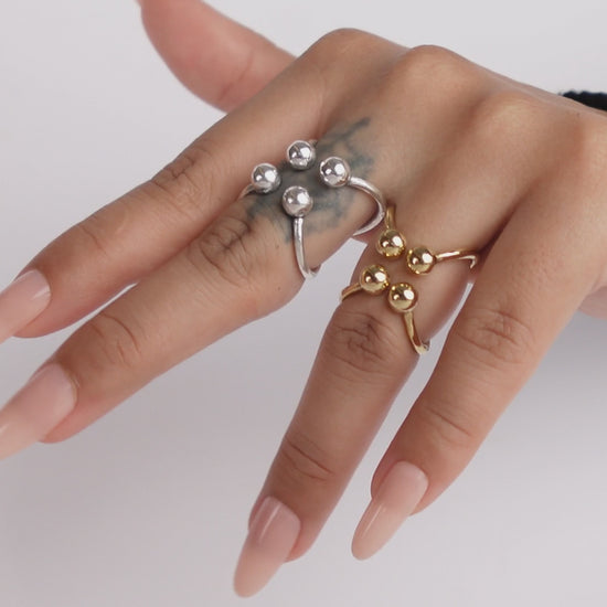Elevate your everyday style with these contemporary orb cluster rings, available in striking gold and silver finishes. Featuring four polished spheres arranged in a geometric cross formation, these rings offer a sleek, minimalist aesthetic with bold attitude.
