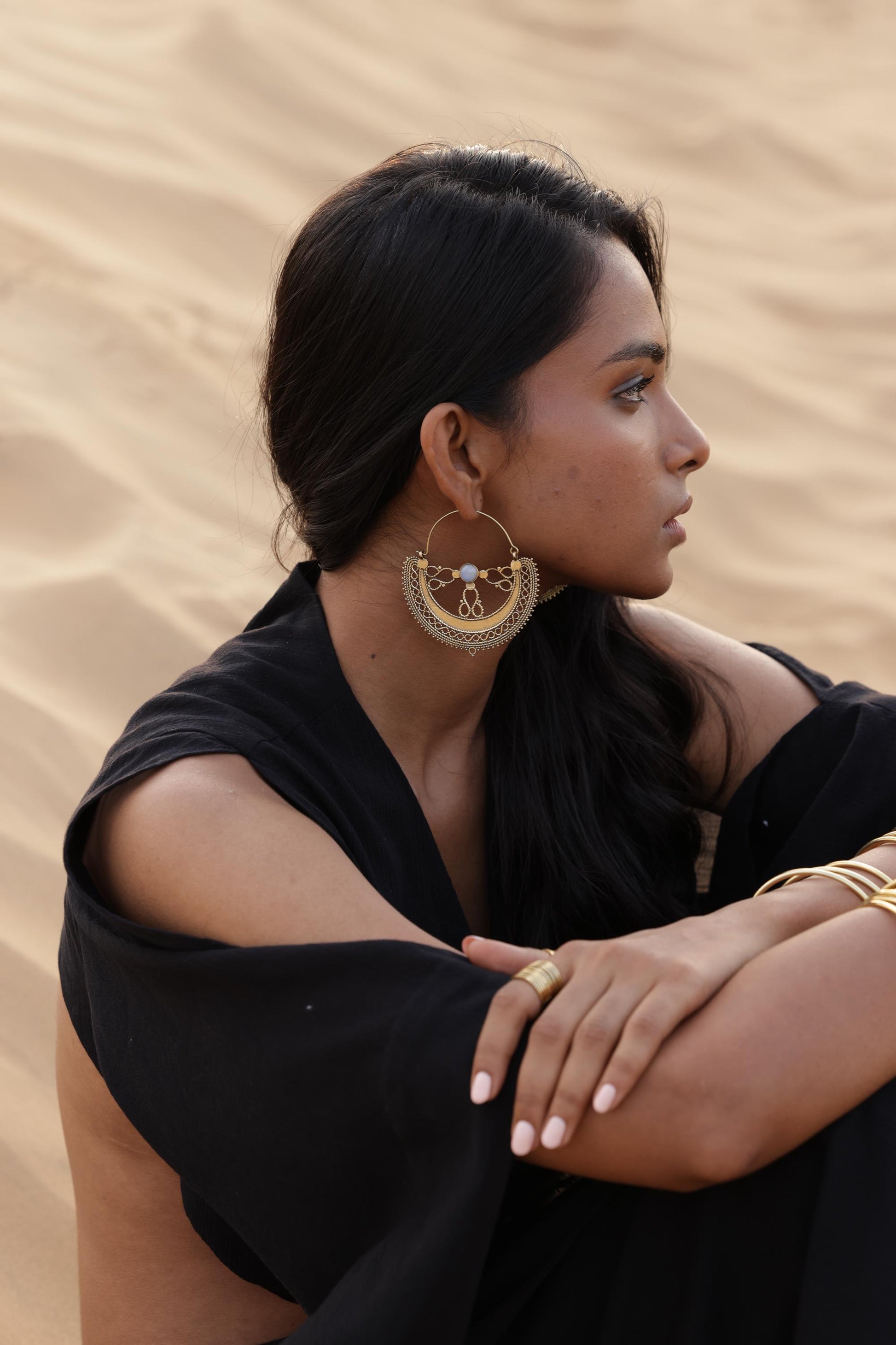 Boho crescent-shaped brass hoops with delicate filigree and center gemstone.