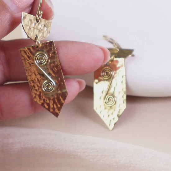 Gaia Hammered Shield Drops - Rustic Brass Earrings with Spiral Wire Detail.
