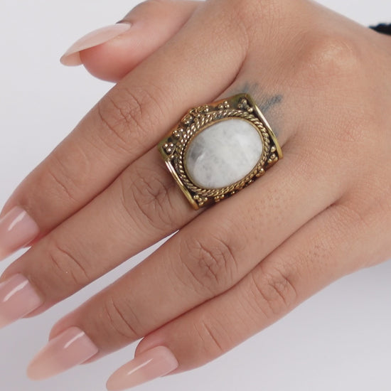 Vintage Brass Ring with White Moonstone – Ethereal Boho Statement.
