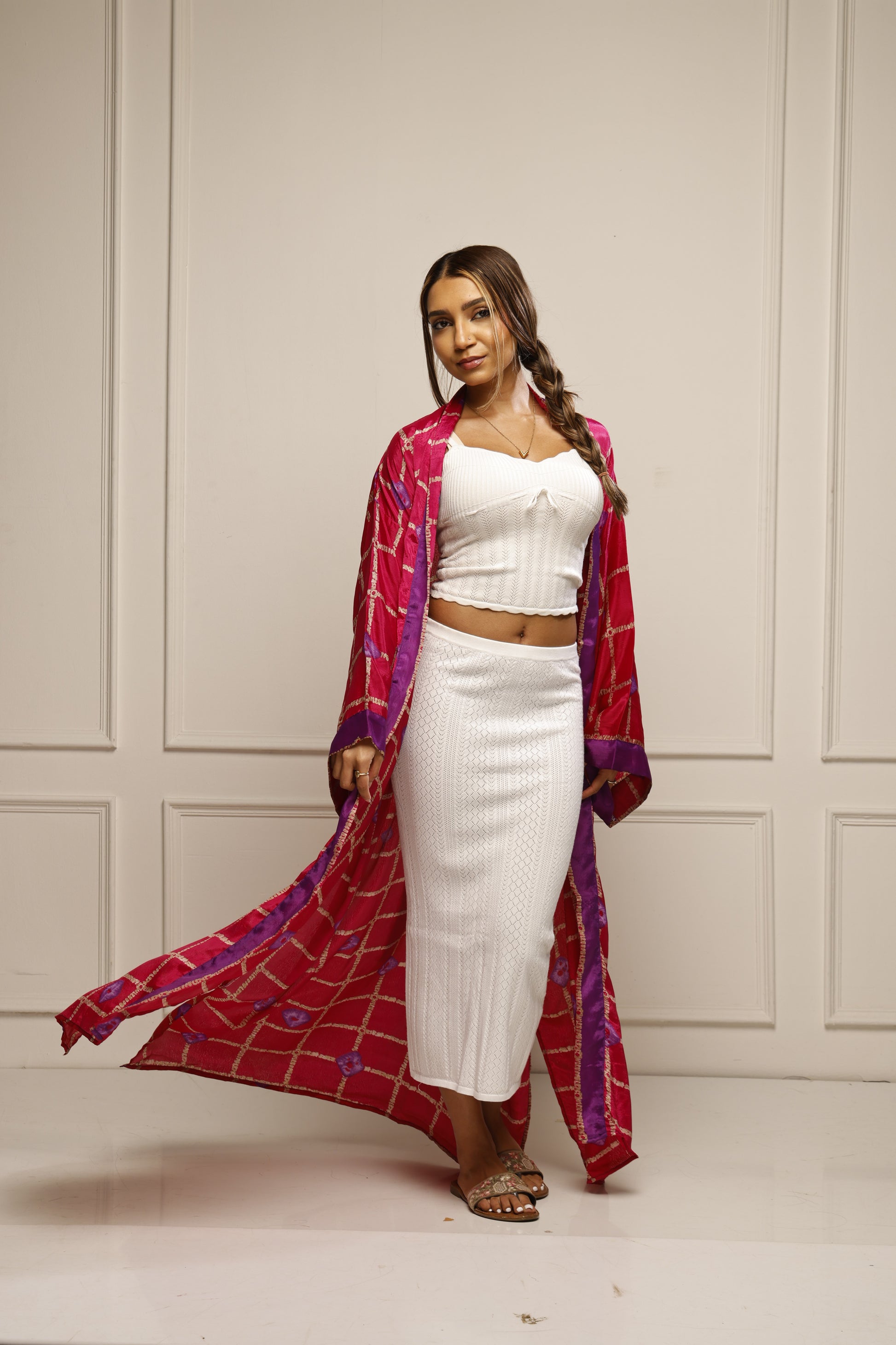 Elevate your wardrobe with our elegant Saree Kimono, a modern fusion of traditional inspiration and effortless contemporary style. Designed in a lightweight, sheer fabric, this longline kimono drapes beautifully and adds graceful movement to any outfit.