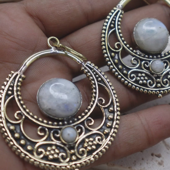 Boho Filigree Crescent Hoop Earrings with Natural Stone Center.